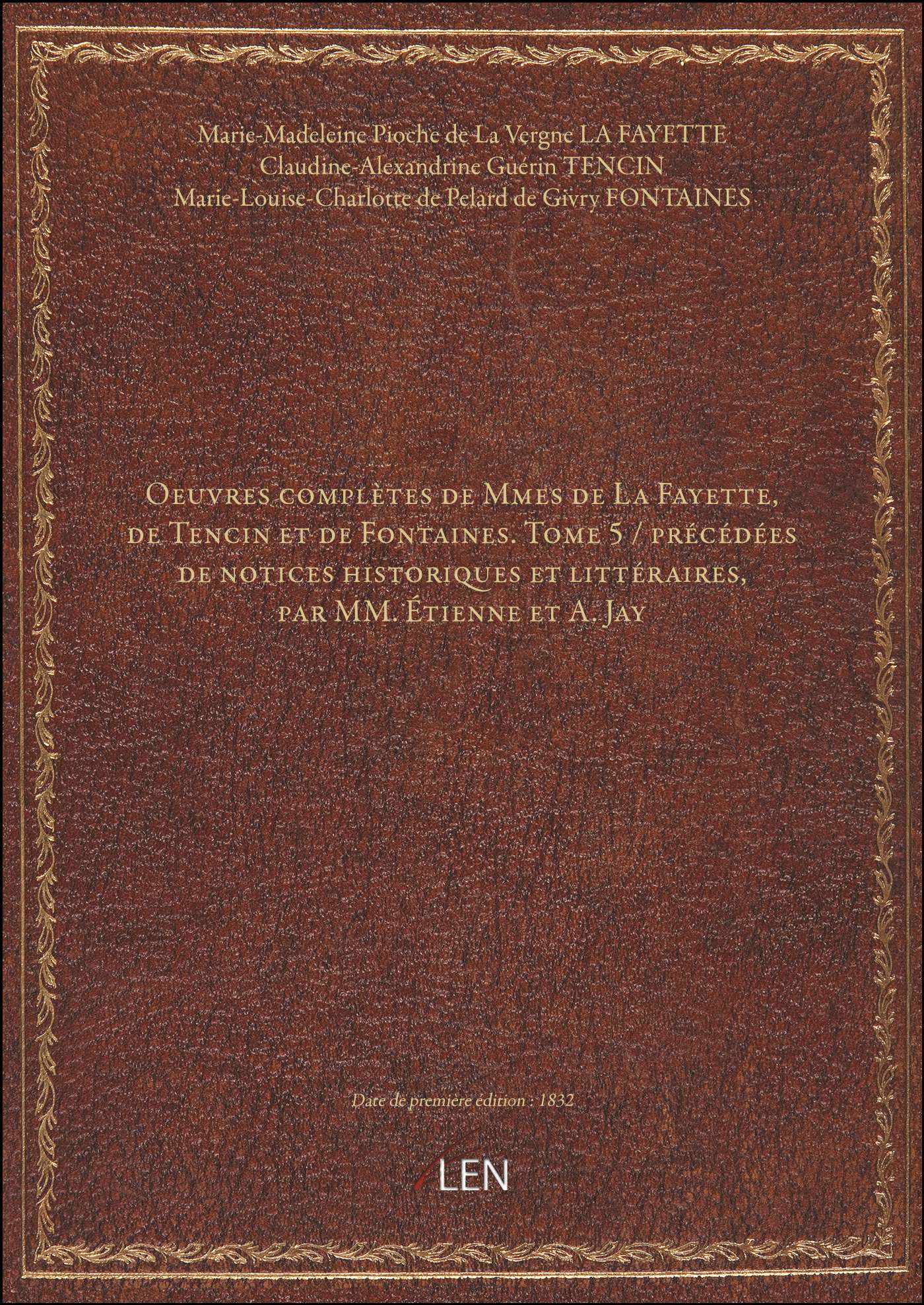 Titre complet : Oeuvres complètes de Mmes de La Fayette, de Tencin et de Fontaines. Tome 5 / précédées de notices historiques et littéraires, par MM. Étienne et A. Jay