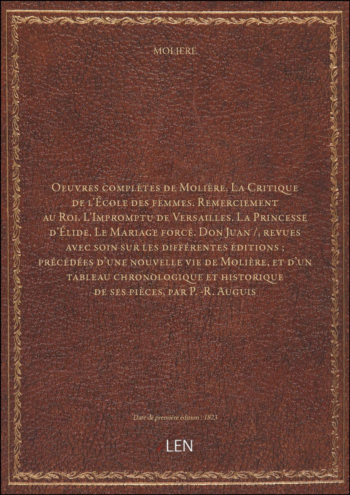 Titre complet : Oeuvres complètes de Molière. La Critique de l'École des femmes. Remerciement au Roi. L'Impromptu de Versailles. La Princesse d'Élide. Le Mariage forcé. Don Juan / , revues avec soin sur les différentes éditions ; précédées d'une nouvelle vie de Molière, et d'un tableau chronologique et historique de ses pièces, par P.-R. Auguis