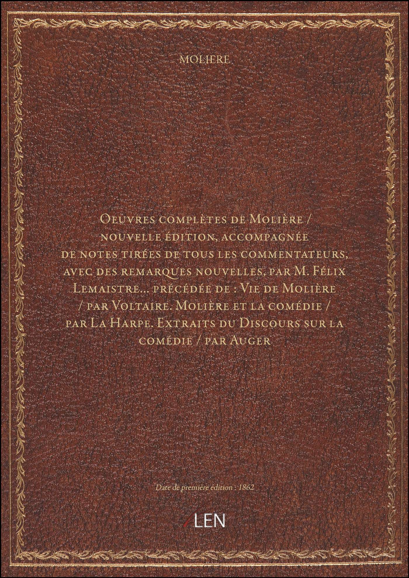 Titre complet : Oeuvres complètes de Molière / nouvelle édition, accompagnée de notes tirées de tous les commentateurs, avec des remarques nouvelles, par M. Félix Lemaistre.... précédée de: Vie de Molière / par Voltaire. Molière et la comédie / par La Harpe. Extraits du Discours sur la comédie / par Auger