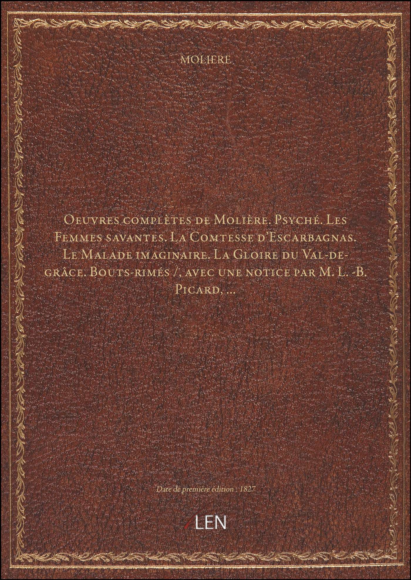Titre complet : Oeuvres complètes de Molière. Psyché. Les Femmes savantes. La Comtesse d'Escarbagnas. Le Malade imaginaire. La Gloire du Val-de-grâce. Bouts-rimés / , avec une notice par M. L.-B. Picard,...