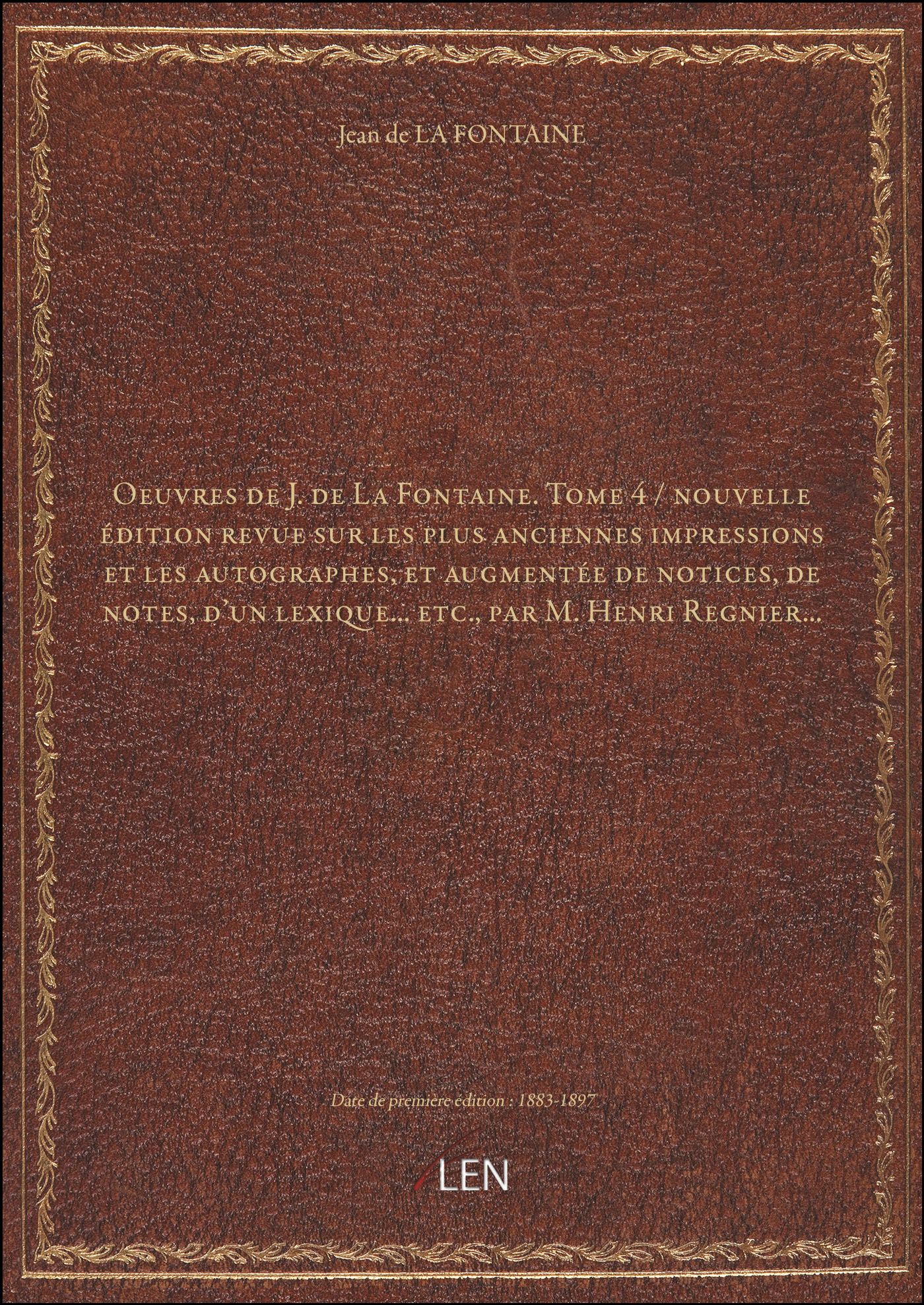 Titre complet : Oeuvres de J. de La Fontaine. Tome 4 / nouvelle édition revue sur les plus anciennes impressions et les autographes, et augmentée de notices, de notes, d'un lexique... etc., par M. Henri Regnier...