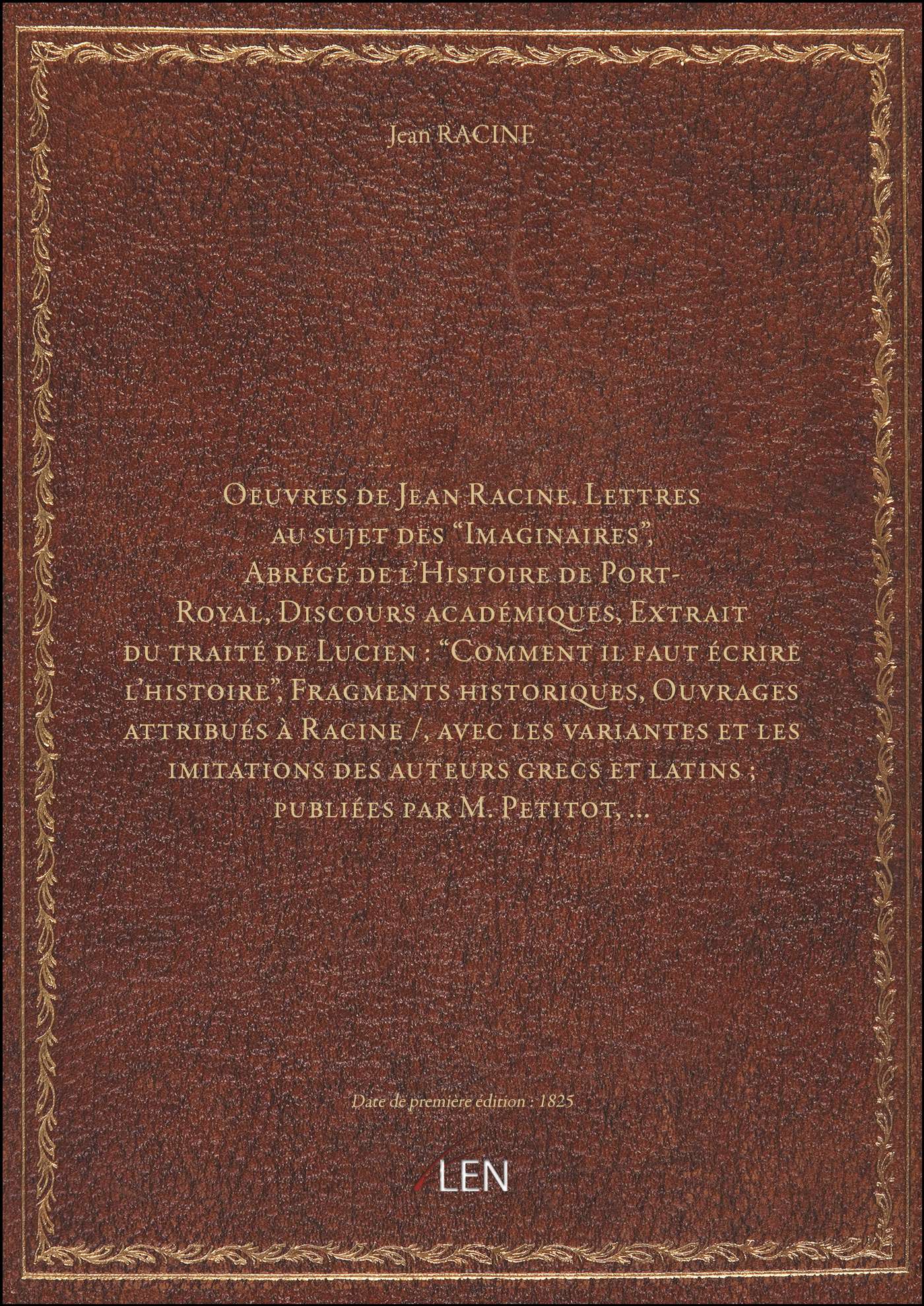Titre complet : Oeuvres de Jean Racine. Lettres au sujet des "Imaginaires", Abrégé de l'Histoire de Port-Royal, Discours académiques, Extrait du traité de Lucien : "Comment il faut écrire l'histoire", Fragments historiques, Ouvrages attribués à Racine / , avec les variantes et les imitations des auteurs grecs et latins ; publiées par M. Petitot,...