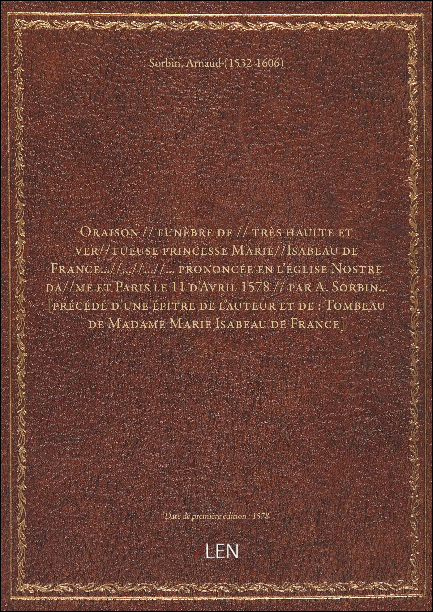 Titre complet : Oraison // funèbre de // très haulte et ver//tueuse princesse Marie//Isabeau de France...//...//...//... prononcée en l'église Nostre da//me et Paris le 11 d'Avril 1578 // par A. Sorbin... [précédé d'une épitre de l'auteur et de : Tombeau de Madame Marie Isabeau de France]