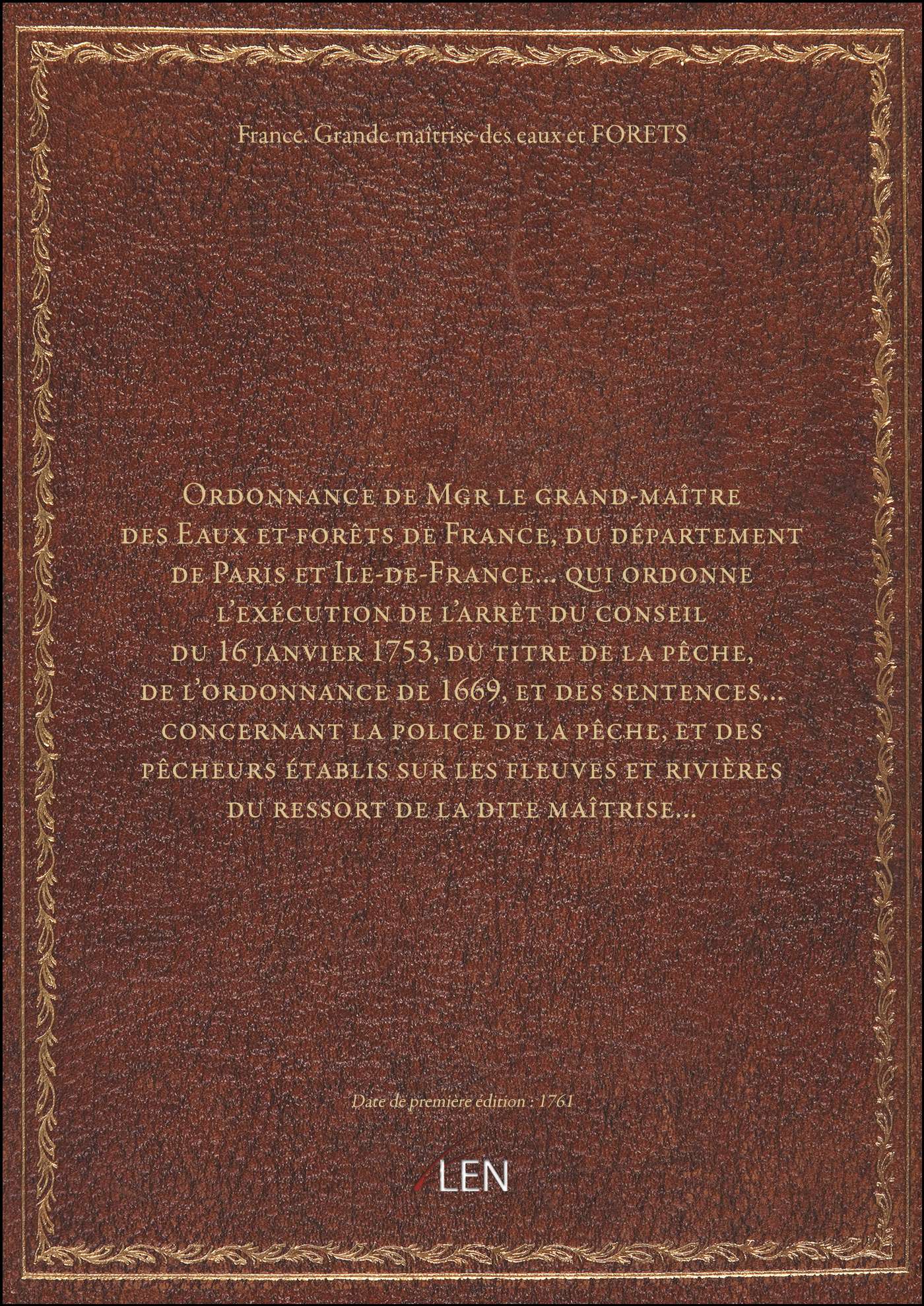 Titre complet : Ordonnance de Mgr le grand-maître des Eaux et forêts de France, du département de Paris et Ile-de-France... qui ordonne l'exécution de l'arrêt du conseil du 16 janvier 1753, du titre de la pêche, de l'ordonnance de 1669, et des sentences... concernant la police de la pêche, et des pêcheurs établis sur les fleuves et rivières du ressort de la dite maîtrise...
