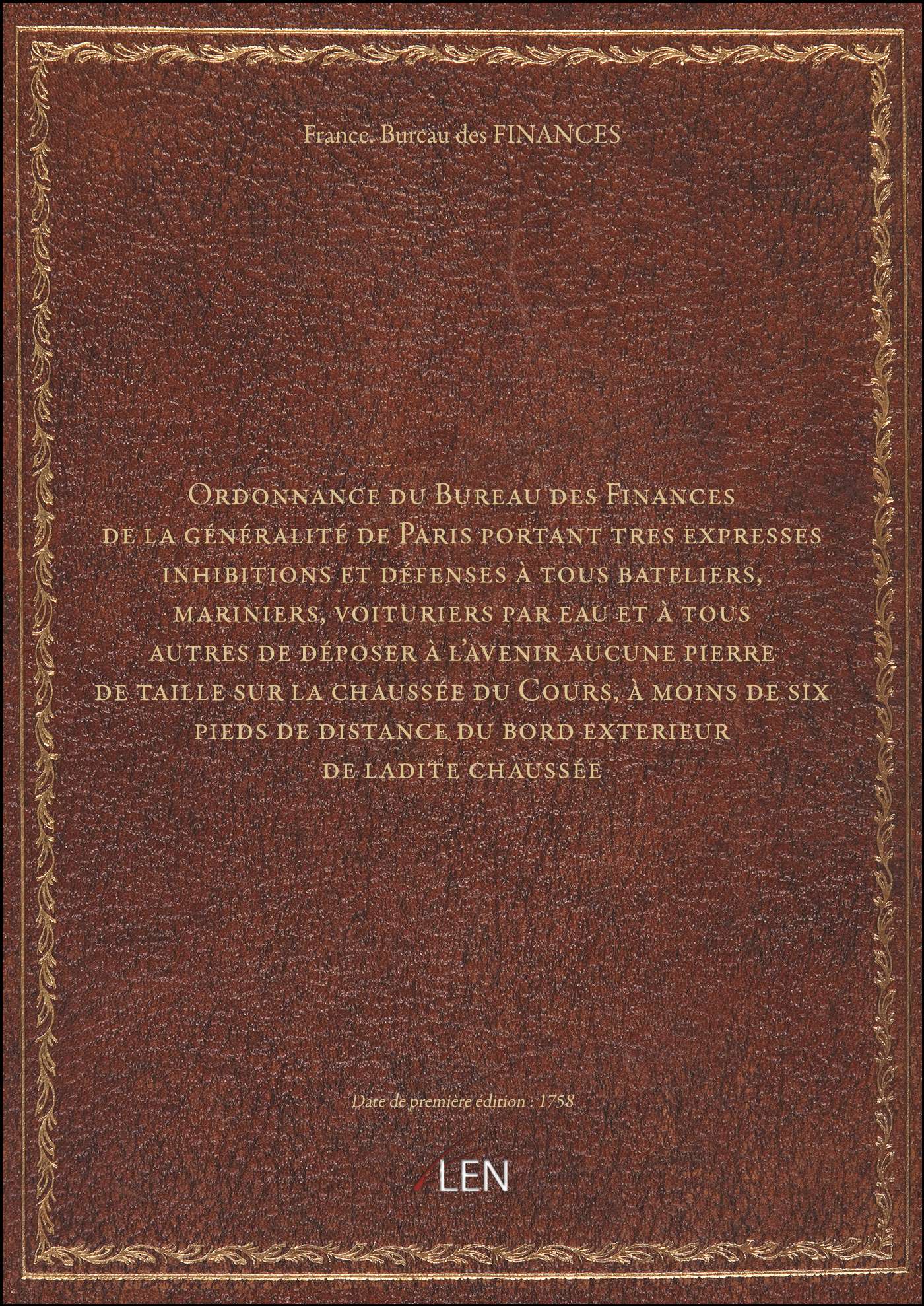 Titre complet : Ordonnance du Bureau des Finances de la généralité de Paris portant tres expresses inhibitions et défenses à tous bateliers, mariniers, voituriers par eau et à tous autres de déposer à l'avenir aucune pierre de taille sur la chaussée du Cours, à moins de six pieds de distance du bord exterieur de ladite chaussée