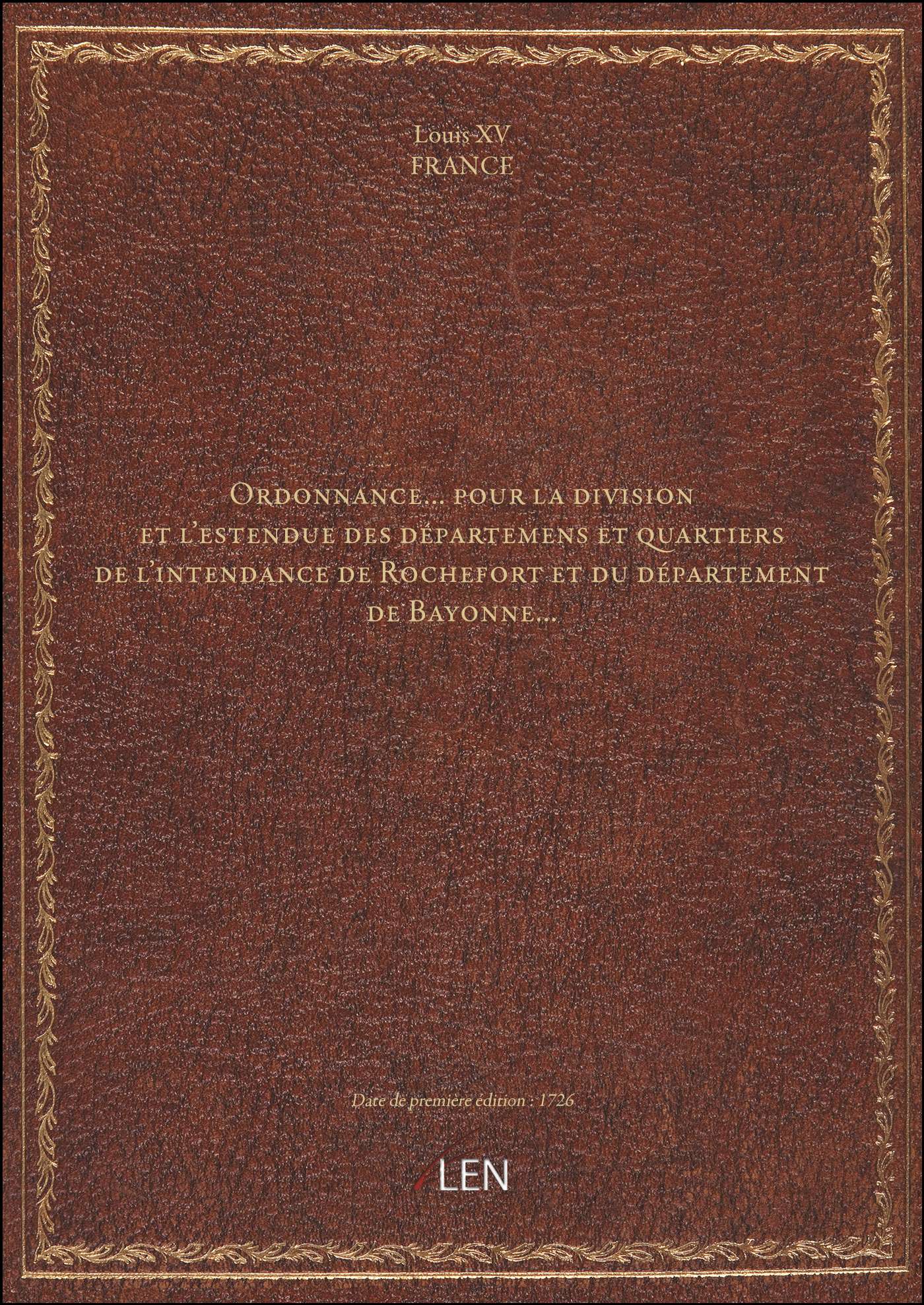 Titre complet : Ordonnance... pour la division et l'estendue des départemens et quartiers de l'intendance de Rochefort et du département de Bayonne...