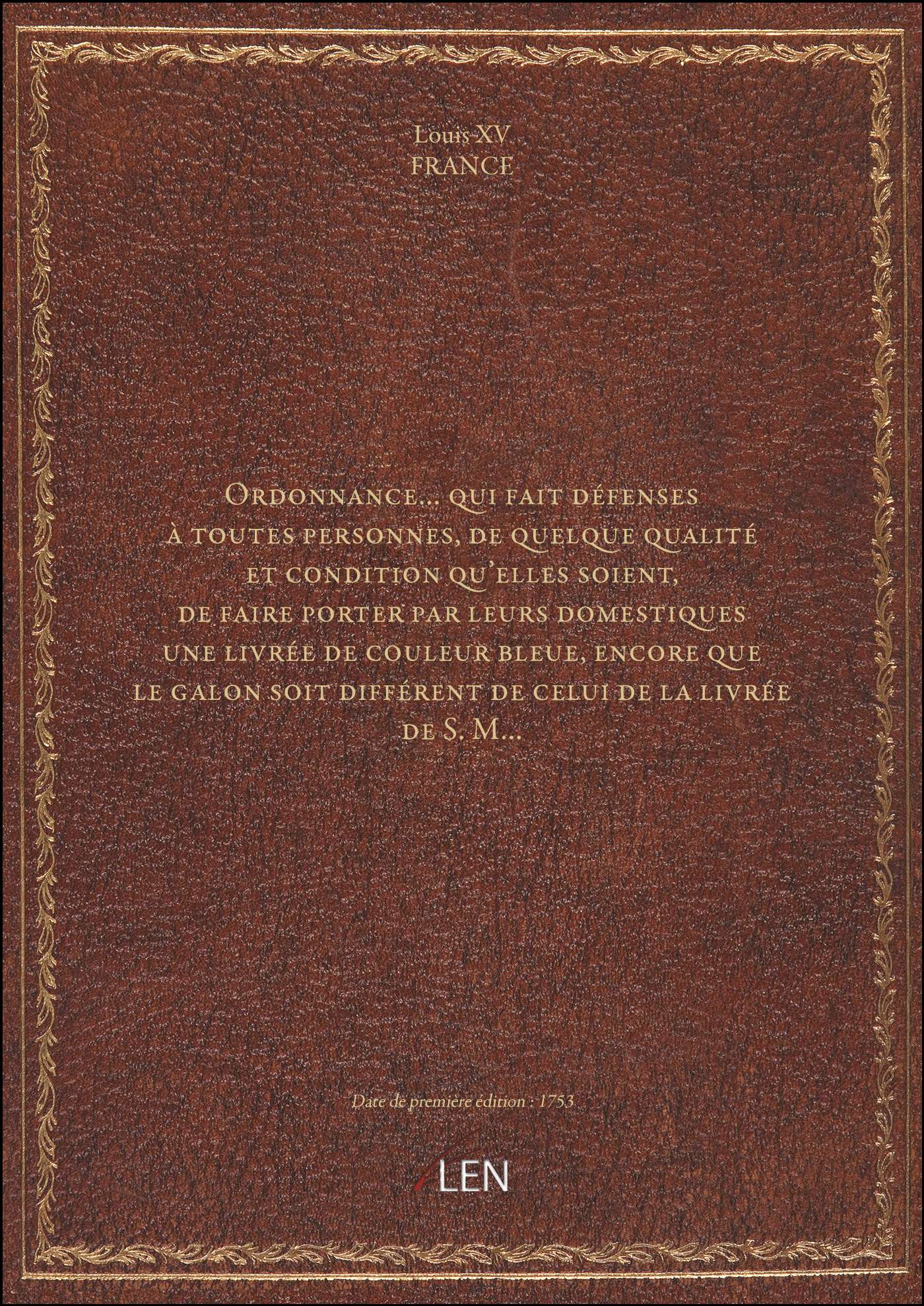 Titre complet : Ordonnance... qui fait défenses à toutes personnes, de quelque qualité et condition qu'elles soient, de faire porter par leurs domestiques une livrée de couleur bleue, encore que le galon soit différent de celui de la livrée de S. M....