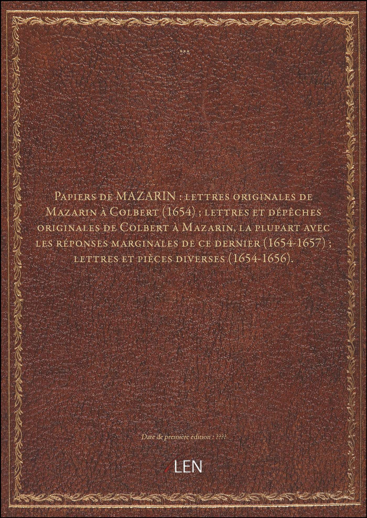Titre complet : Papiers de MAZARIN : lettres originales de Mazarin à Colbert (1654) ; lettres et dépêches originales de Colbert à Mazarin, la plupart avec les réponses marginales de ce dernier (1654-1657) ; lettres et pièces diverses (1654-1656).