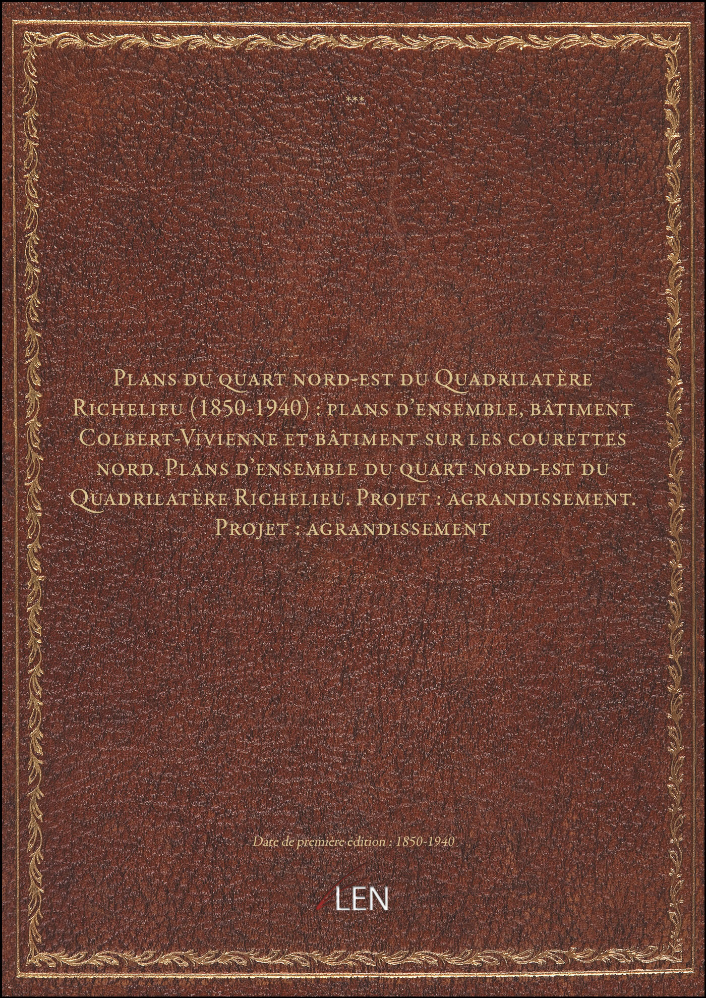 Titre complet : Plans du quart nord-est du Quadrilatère Richelieu (1850-1940) : plans d'ensemble, bâtiment Colbert-Vivienne et bâtiment sur les courettes nord. Plans d'ensemble du quart nord-est du Quadrilatère Richelieu. Projet : agrandissement. Projet : agrandissement