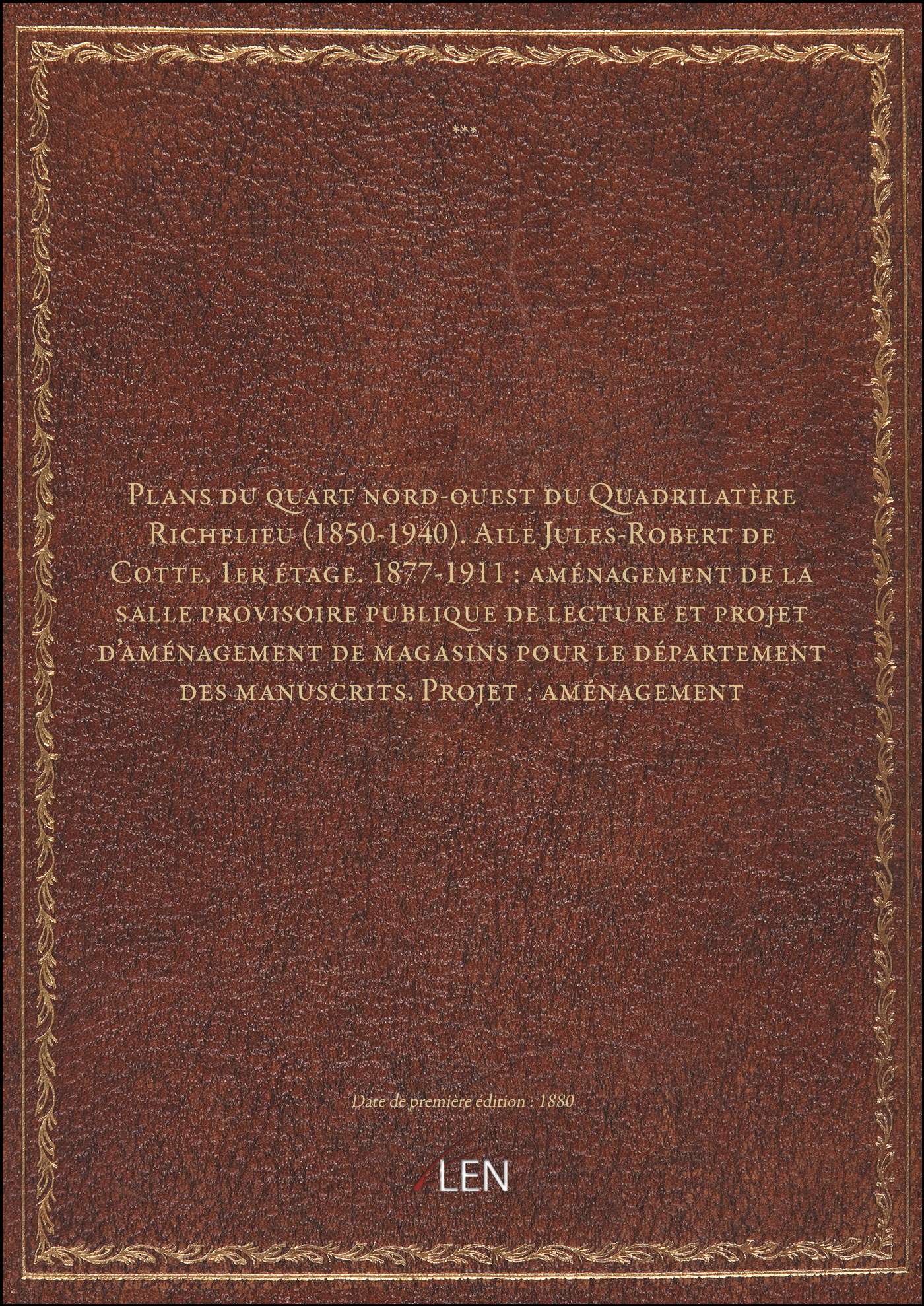 Plans du quart nord-ouest du Quadrilatère Richelieu (1850-1940). Aile Jules-Robert de Cotte. 1er étage. 1877-1911 : aménagement de la salle provisoire publique de lecture et projet d'aménagement de magasins pour le département des manuscrits. Projet [...]