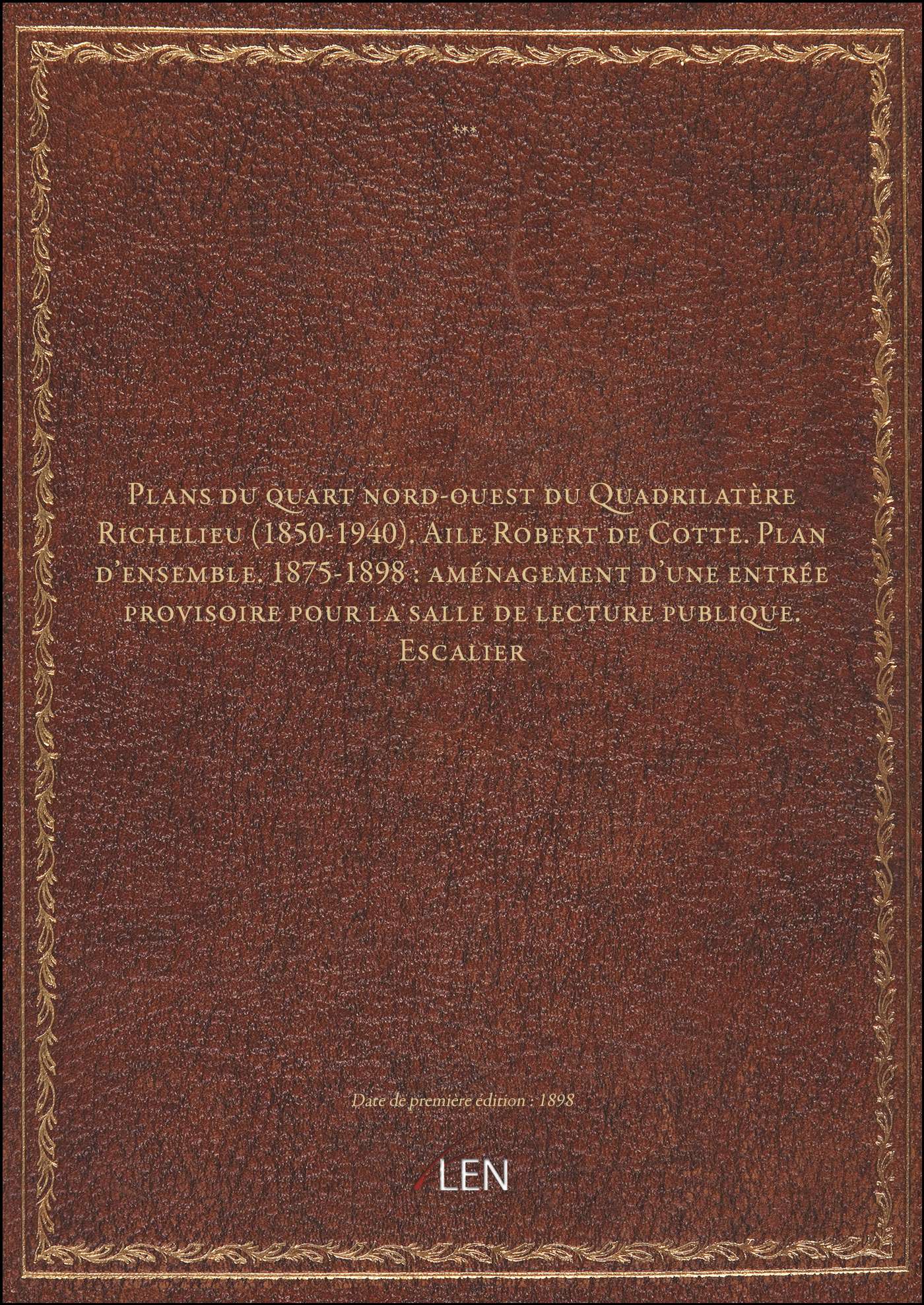 Titre complet : Plans du quart nord-ouest du Quadrilatère Richelieu (1850-1940). Aile Robert de Cotte. Plan d'ensemble. 1875-1898 : aménagement d'une entrée provisoire pour la salle de lecture publique. Escalier