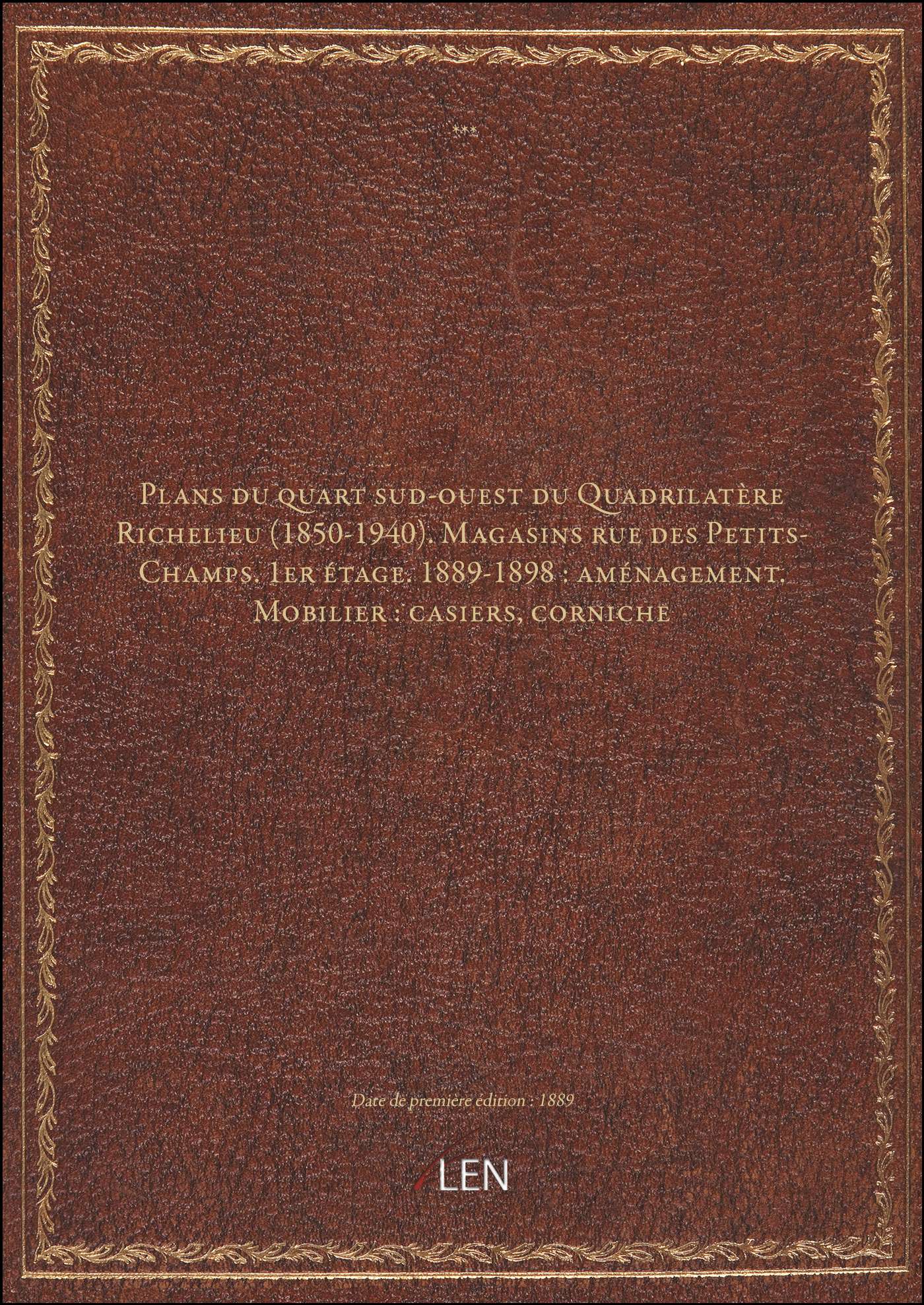 Plans du quart sud-ouest du Quadrilatère Richelieu (1850-1940). Magasins rue des Petits-Champs. 1er étage. 1889-1898 : aménagement. Mobilier : casiers, corniche
