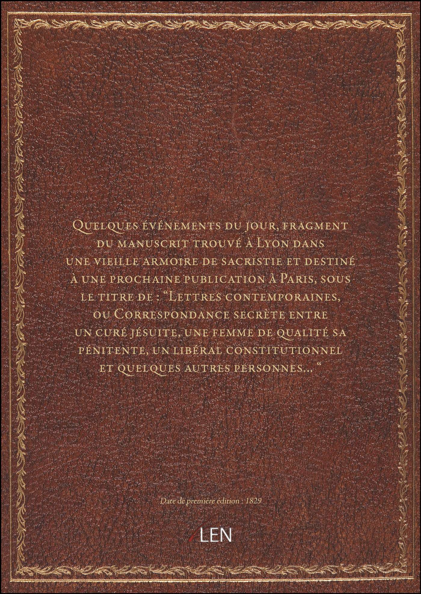 Titre complet : Quelques événements du jour , fragment du manuscrit trouvé à Lyon dans une vieille armoire de sacristie et destiné à une prochaine publication à Paris, sous le titre de : "Lettres contemporaines, ou Correspondance secrète entre un curé jésuite, une femme de qualité sa pénitente, un libéral constitutionnel et quelques autres personnes..."