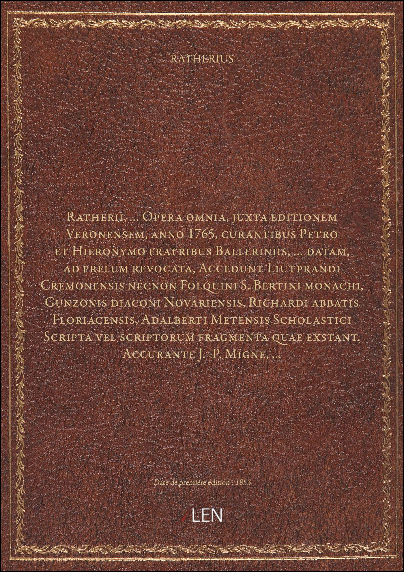 Titre complet : Ratherii,... Opera omnia, juxta editionem Veronensem, anno 1765, curantibus Petro et Hieronymo fratribus Balleriniis,... datam, ad prelum revocata, Accedunt Liutprandi Cremonensis necnon Folquini S. Bertini monachi, Gunzonis diaconi Novariensis, Richardi abbatis Floriacensis, Adalberti Metensis Scholastici Scripta vel scriptorum fragmenta quae exstant. Accurante J.-P. Migne,...