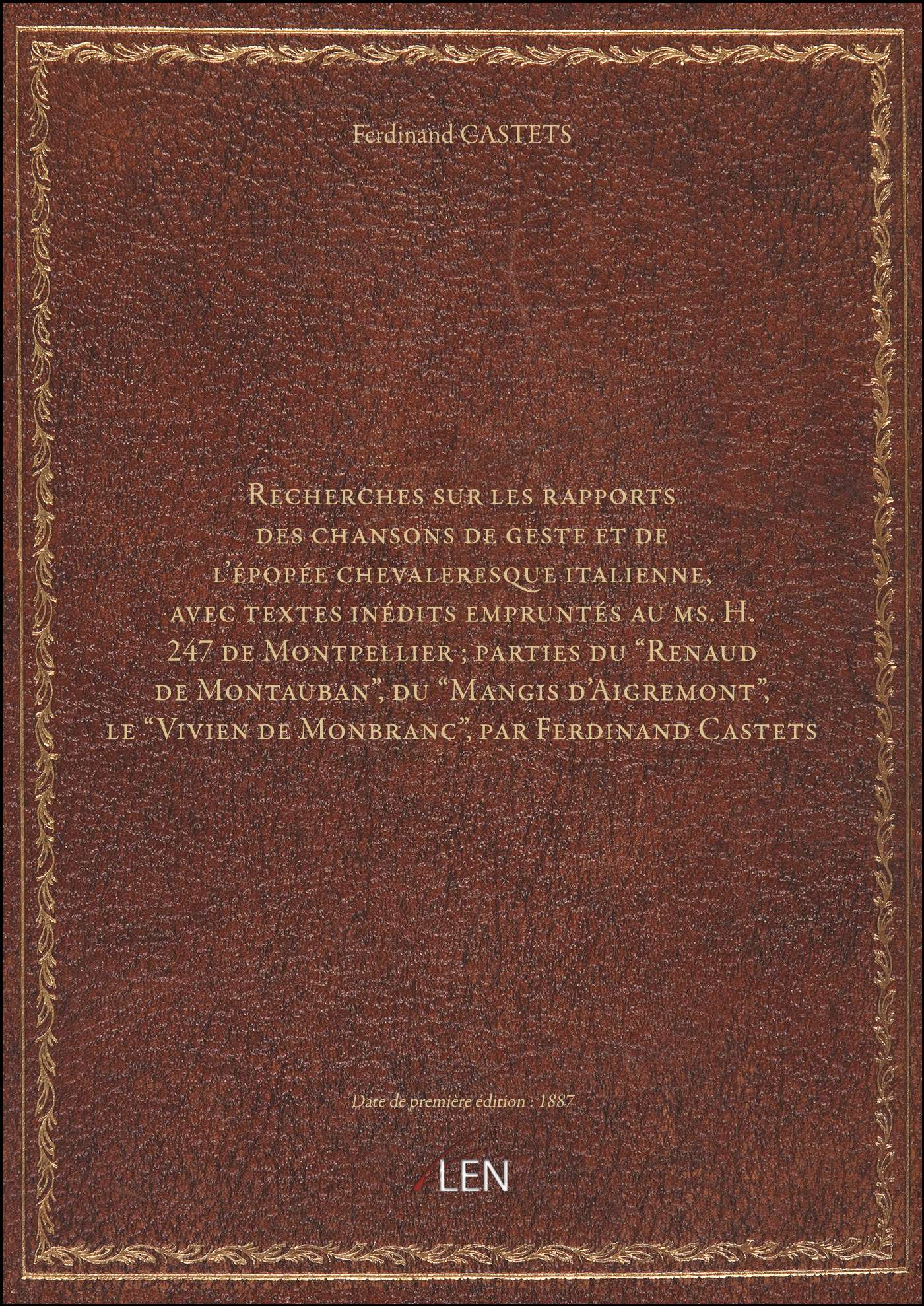 Titre complet : Recherches sur les rapports des chansons de geste et de l'épopée chevaleresque italienne, avec textes inédits empruntés au ms. H. 247 de Montpellier ; parties du "Renaud de Montauban", du "Mangis d'Aigremont", le "Vivien de Monbranc", par Ferdinand Castets