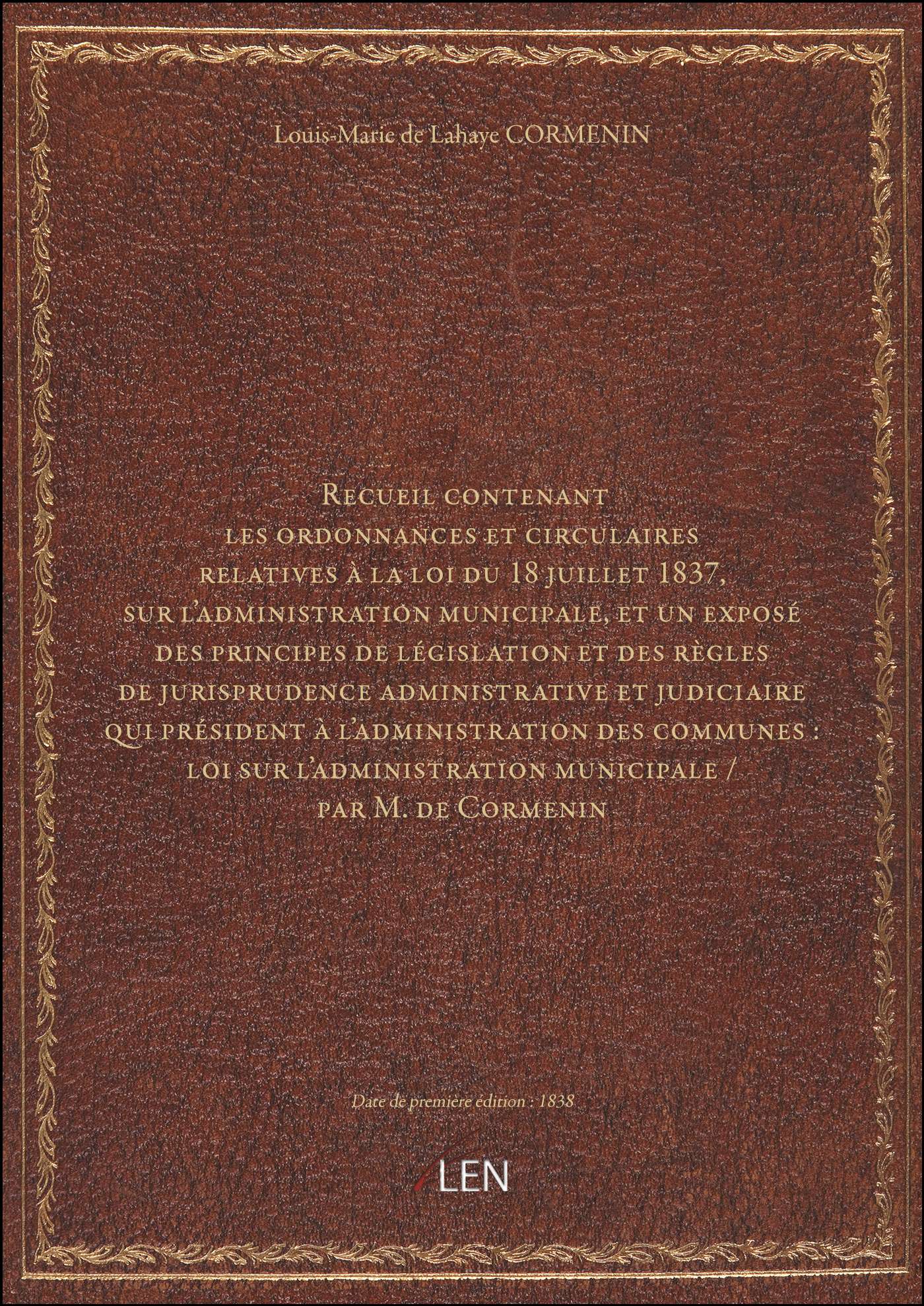 Titre complet : Recueil contenant les ordonnances et circulaires relatives à la loi du 18 juillet 1837, sur l'administration municipale, et un exposé des principes de législation et des règles de jurisprudence administrative et judiciaire qui président à l'administration des communes : loi sur l'administration municipale / par M. de Cormenin