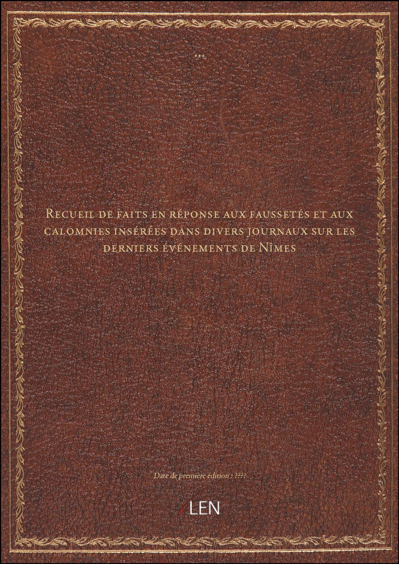 Titre complet : Recueil de faits en réponse aux faussetés et aux calomnies insérées dans divers journaux sur les derniers événements de Nîmes