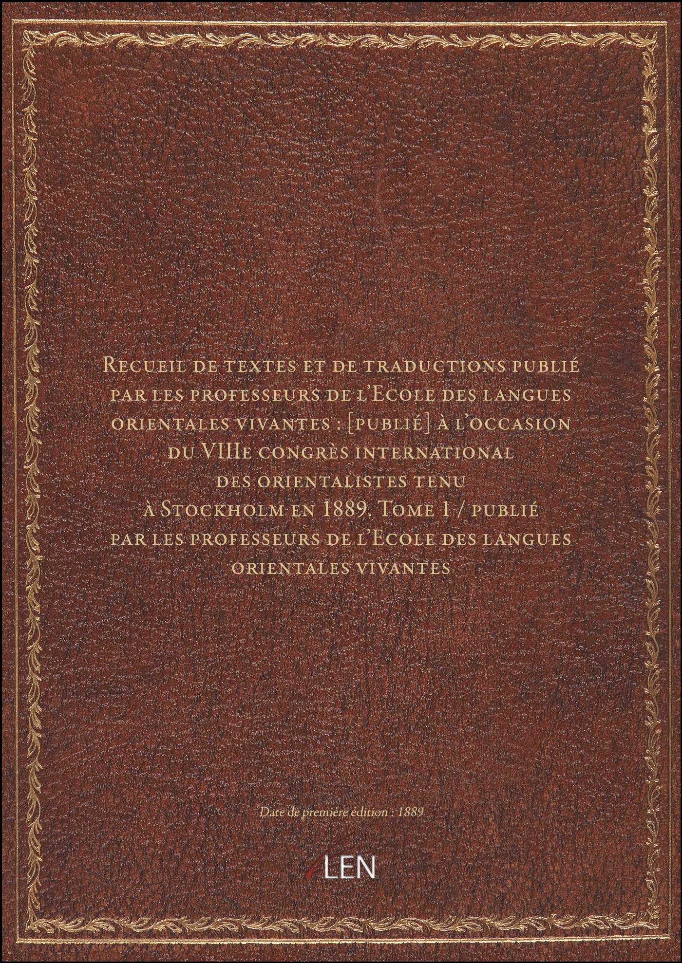 Titre complet : Recueil de textes et de traductions publié par les professeurs de l'Ecole des langues orientales vivantes : [publié] à l'occasion du VIIIe congrès international des orientalistes tenu à Stockholm en 1889. Tome 1 / publié par les professeurs de l'Ecole des langues orientales vivantes