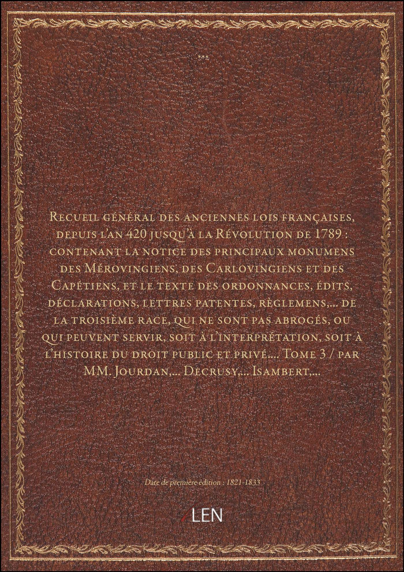 Titre complet : Recueil général des anciennes lois françaises, depuis l'an 420 jusqu'à la Révolution de 1789 : contenant la notice des principaux monumens des Mérovingiens, des Carlovingiens et des Capétiens, et le texte des ordonnances, édits, déclarations, lettres patentes, règlemens,... de la troisième race, qui ne sont pas abrogés, ou qui peuvent servir, soit à l'interprétation, soit à l'histoire du droit public et privé.... Tome 3 / par MM. Jourdan,... Decrusy,... Isambert,...