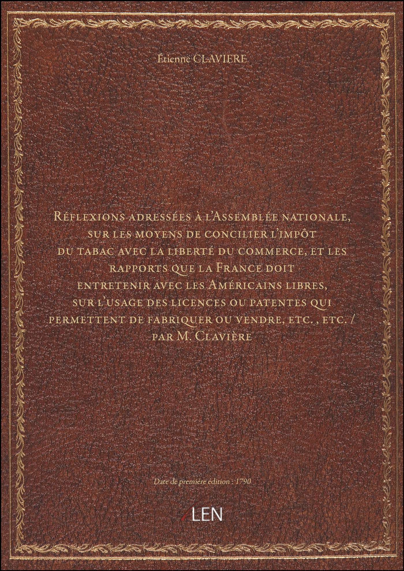Titre complet : Réflexions adressées à l'Assemblée nationale, sur les moyens de concilier l'impôt du tabac avec la liberté du commerce, et les rapports que la France doit entretenir avec les Américains libres, sur l'usage des licences ou patentes qui permettent de fabriquer ou vendre, etc., etc. ([Reprod.]) / par M. Clavière