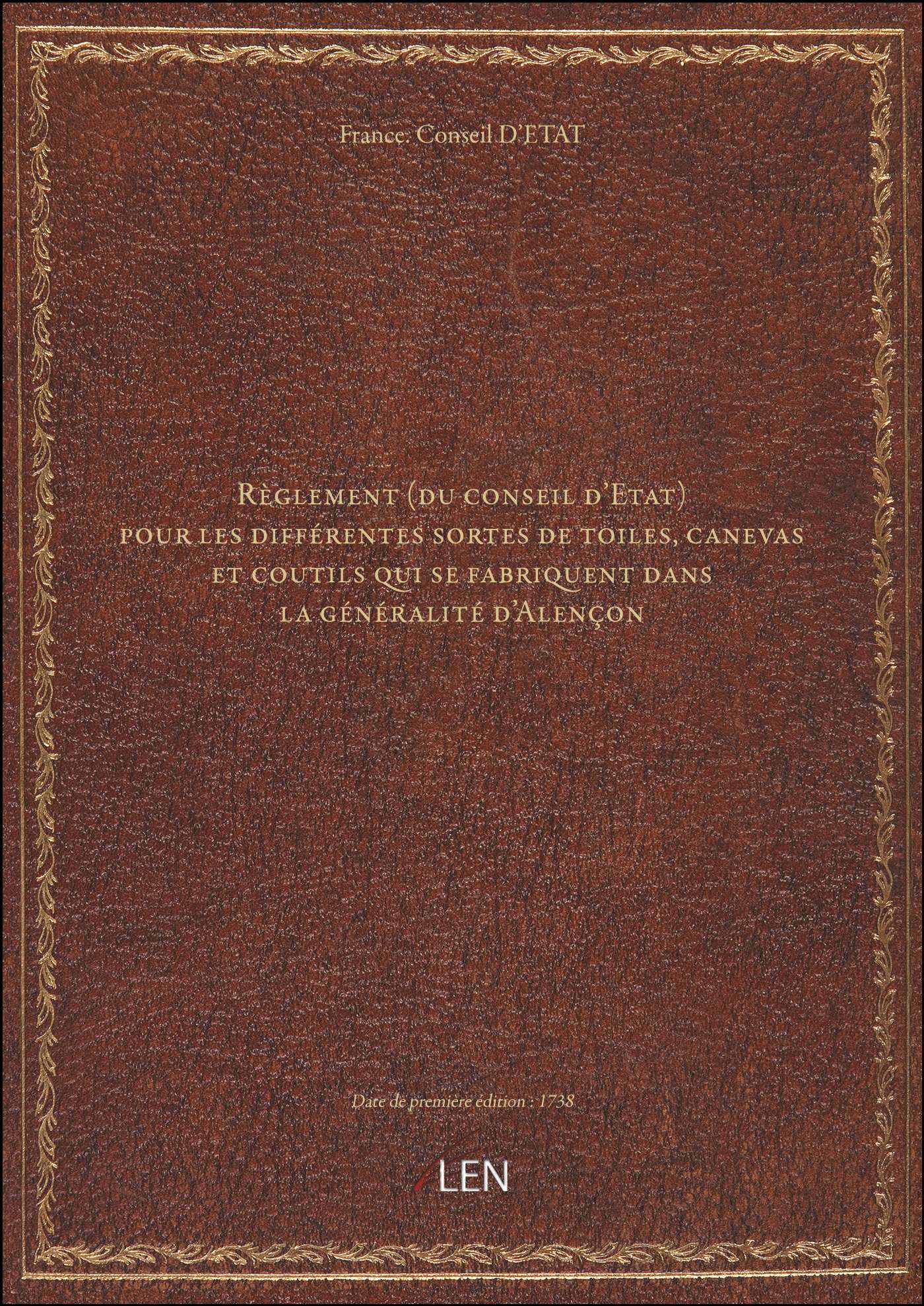 Titre complet : Règlement (du conseil d'Etat) pour les différentes sortes de toiles, canevas et coutils qui se fabriquent dans la généralité d'Alençon