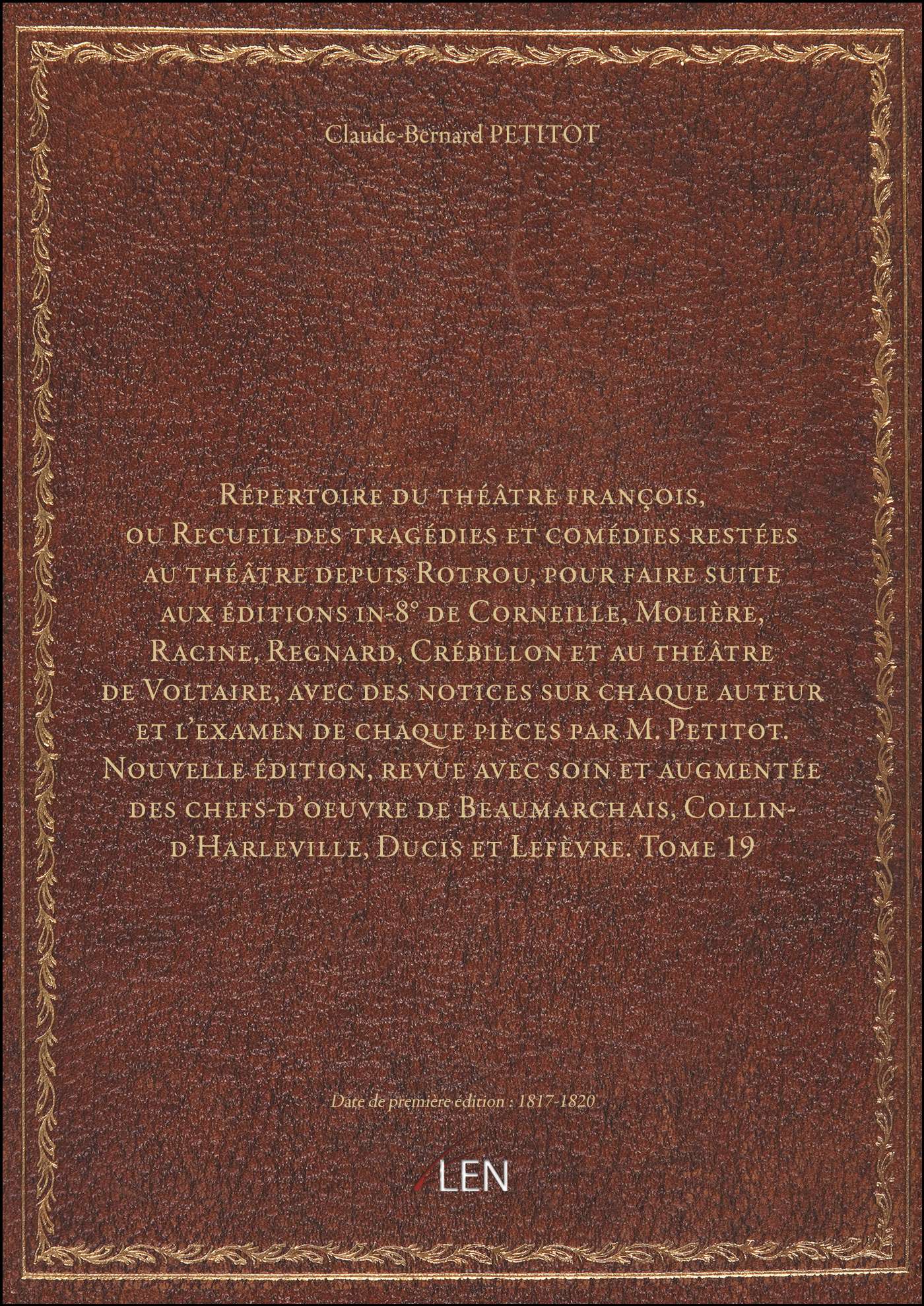 Titre complet : Répertoire du théâtre françois, ou Recueil des tragédies et comédies restées au théâtre depuis Rotrou, pour faire suite aux éditions in-8° de Corneille, Molière, Racine, Regnard, Crébillon et au théâtre de Voltaire, avec des notices sur chaque auteur et l'examen de chaque pièces par M. Petitot. Nouvelle édition, revue avec soin et augmentée des chefs-d'oeuvre de Beaumarchais, Collin-d'Harleville, Ducis et Lefèvre. Tome 19