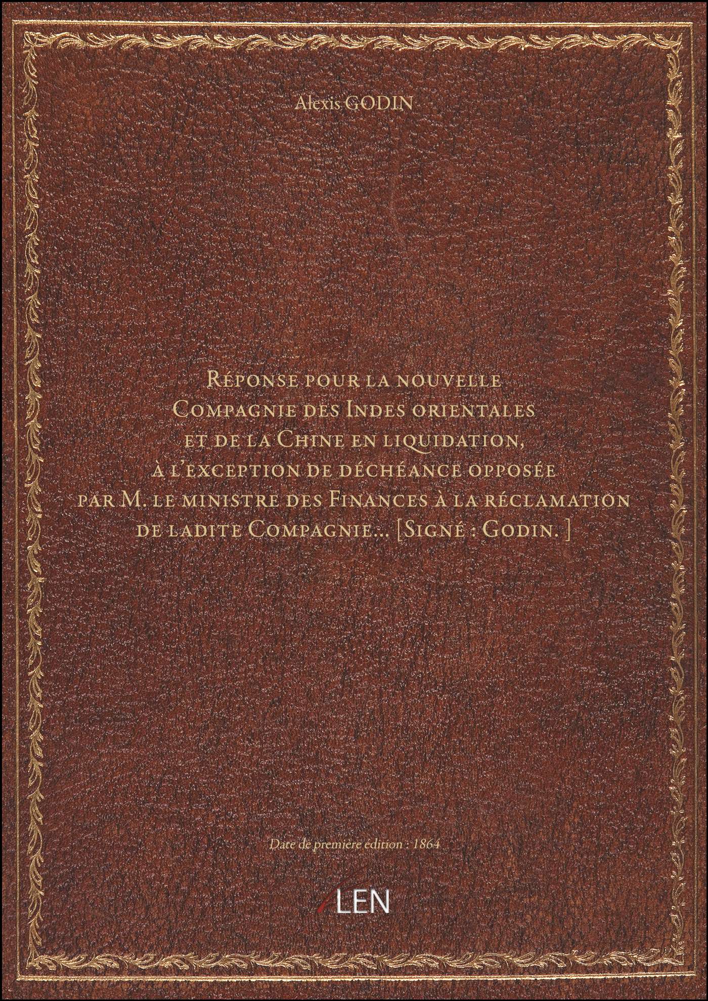 Titre complet : Réponse pour la nouvelle Compagnie des Indes orientales et de la Chine en liquidation, à l'exception de déchéance opposée par M. le ministre des Finances à la réclamation de ladite Compagnie... [Signé : Godin.]