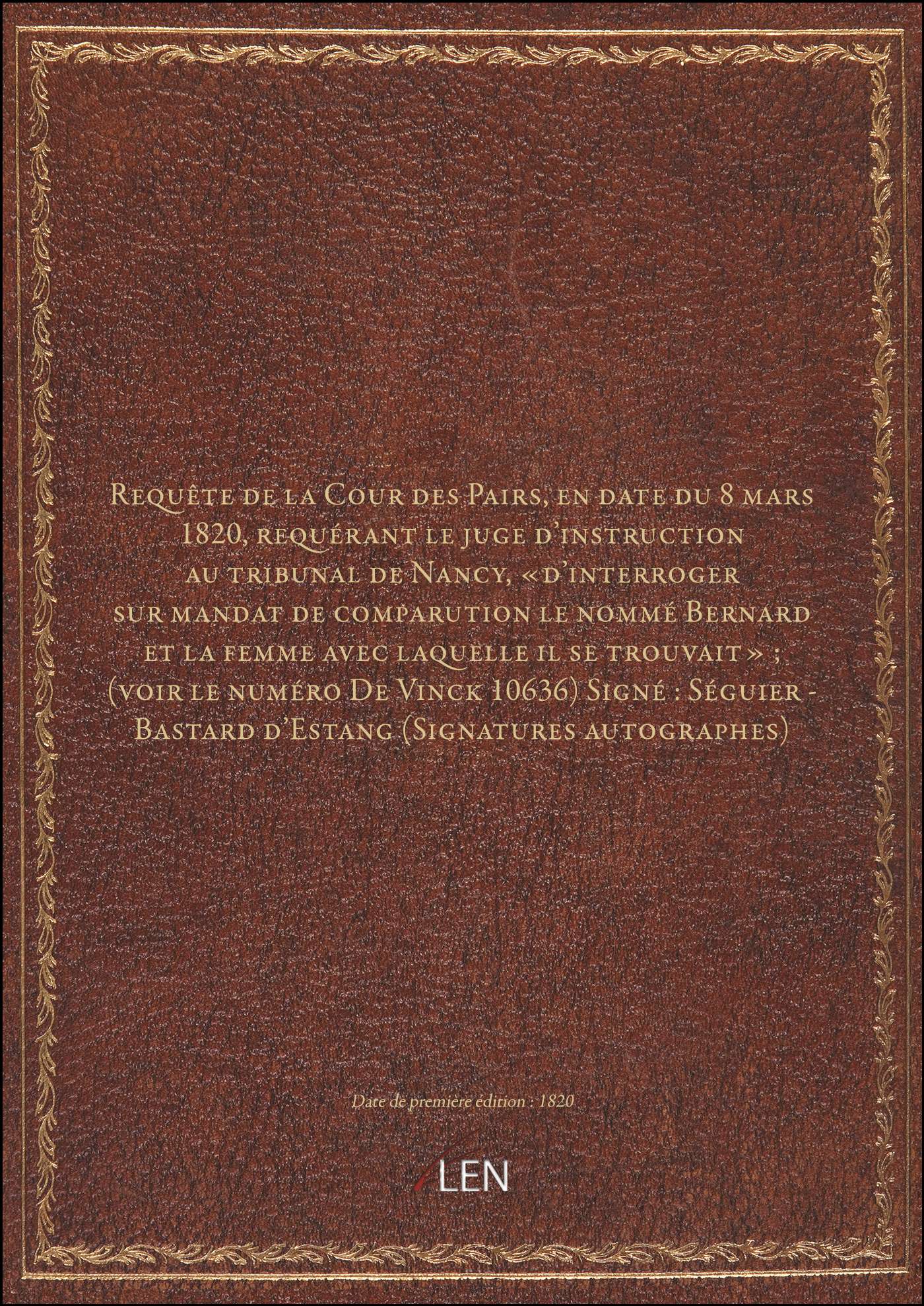 Titre complet : Requête de la Cour des Pairs, en date du 8 mars 1820, requérant le juge d'instruction au tribunal de Nancy, «d'interroger sur mandat de comparution le nommé Bernard et la femme avec laquelle il se trouvait» ; (voir le numéro De Vinck 10636) Signé : Séguier - Bastard d'Estang (Signatures autographes)