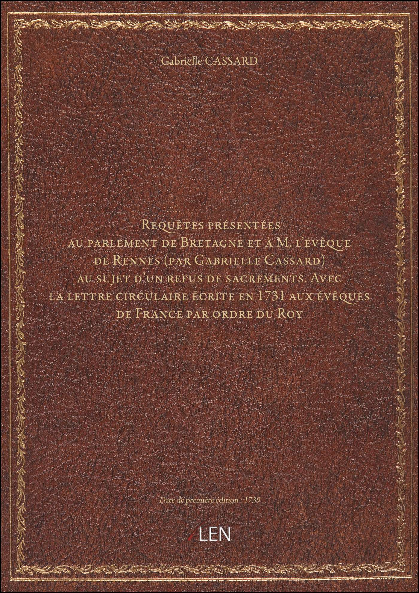 Titre complet : Requêtes présentées au parlement de Bretagne et à M. l'évêque de Rennes (par Gabrielle Cassard) au sujet d'un refus de sacrements. Avec la lettre circulaire écrite en 1731 aux évêques de France par ordre du Roy