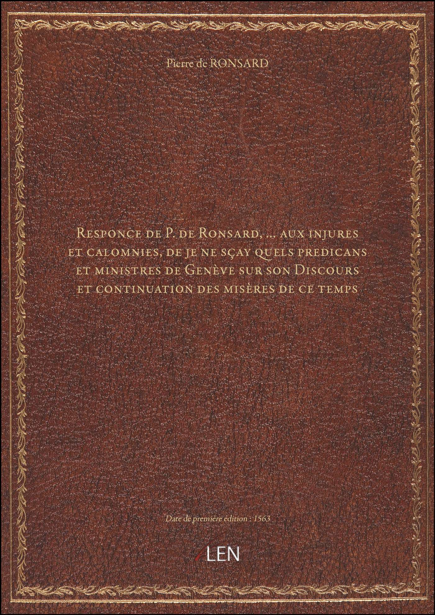 Titre complet : Responce de P. de Ronsard,... aux injures et calomnies, de je ne sçay quels predicans et ministres de Genève sur son Discours et continuation des misères de ce temps