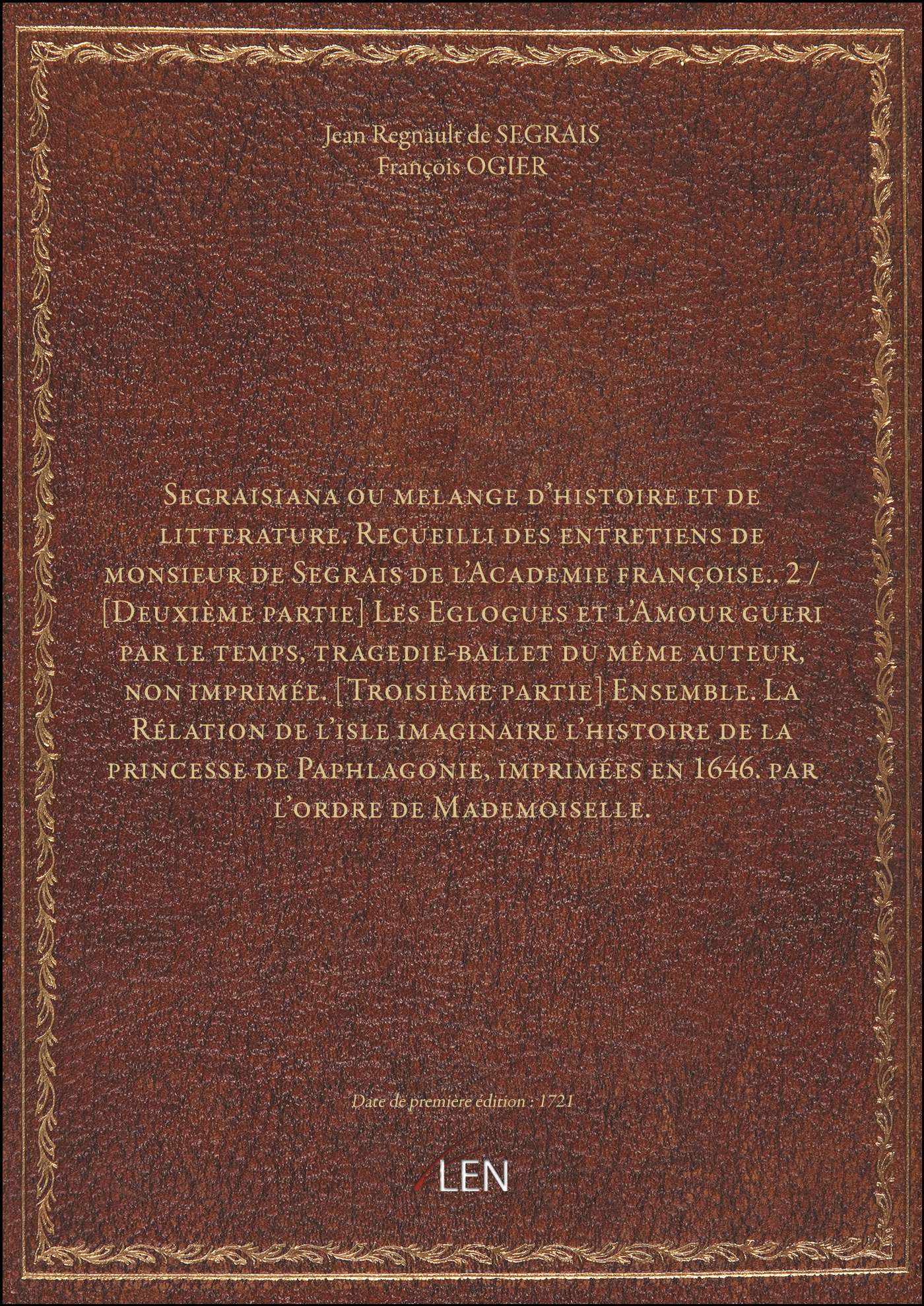 Titre complet : Segraisiana ou melange d'histoire et de litterature. Recueilli des entretiens de monsieur de Segrais de l'Academie françoise.. 2 / [Deuxième partie] Les Eglogues et l'Amour gueri par le temps, tragedie-ballet du même auteur, non imprimée. [Troisième partie] Ensemble. La Rélation de l'isle imaginaire l'histoire de la princesse de Paphlagonie, imprimées en 1646. par l'ordre de Mademoiselle.
