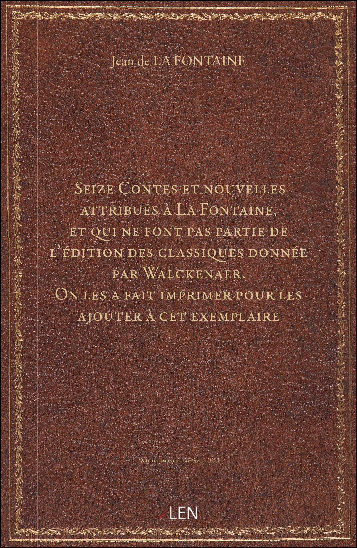 Titre complet : Seize Contes et nouvelles attribués à La Fontaine, et qui ne font pas partie de l'édition des classiques donnée par Walckenaer. On les a fait imprimer pour les ajouter à cet exemplaire