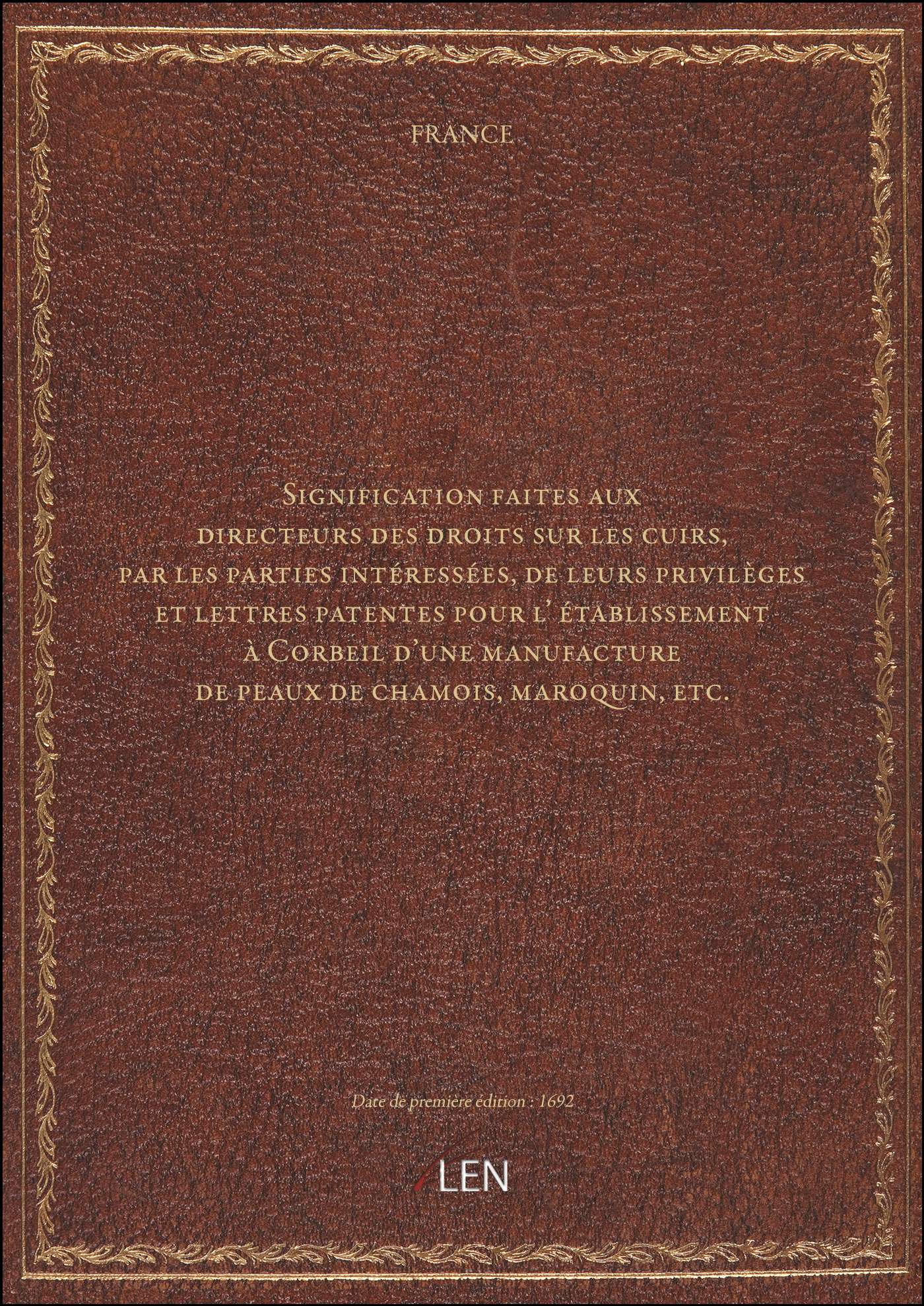 Titre complet : Signification faites aux directeurs des droits sur les cuirs, par les parties intéressées, de leurs privilèges et lettres patentes pour l' établissement à Corbeil d'une manufacture de peaux de chamois, maroquin, etc.