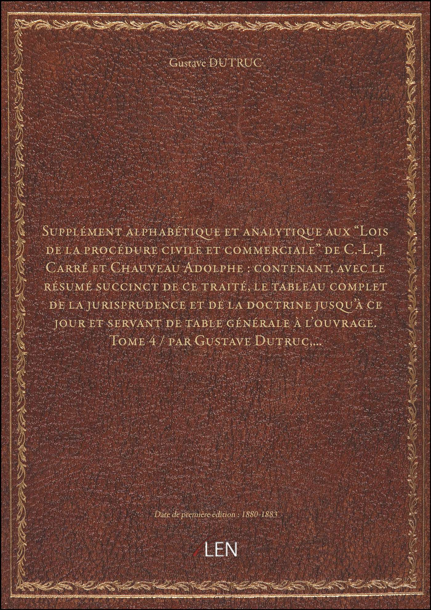 Titre complet : Supplément alphabétique et analytique aux "Lois de la procédure civile et commerciale" de C.-L.-J. Carré et Chauveau Adolphe : contenant, avec le résumé succinct de ce traité, le tableau complet de la jurisprudence et de la doctrine jusqu'à ce jour et servant de table générale à l'ouvrage. Tome 4 / par Gustave Dutruc,...