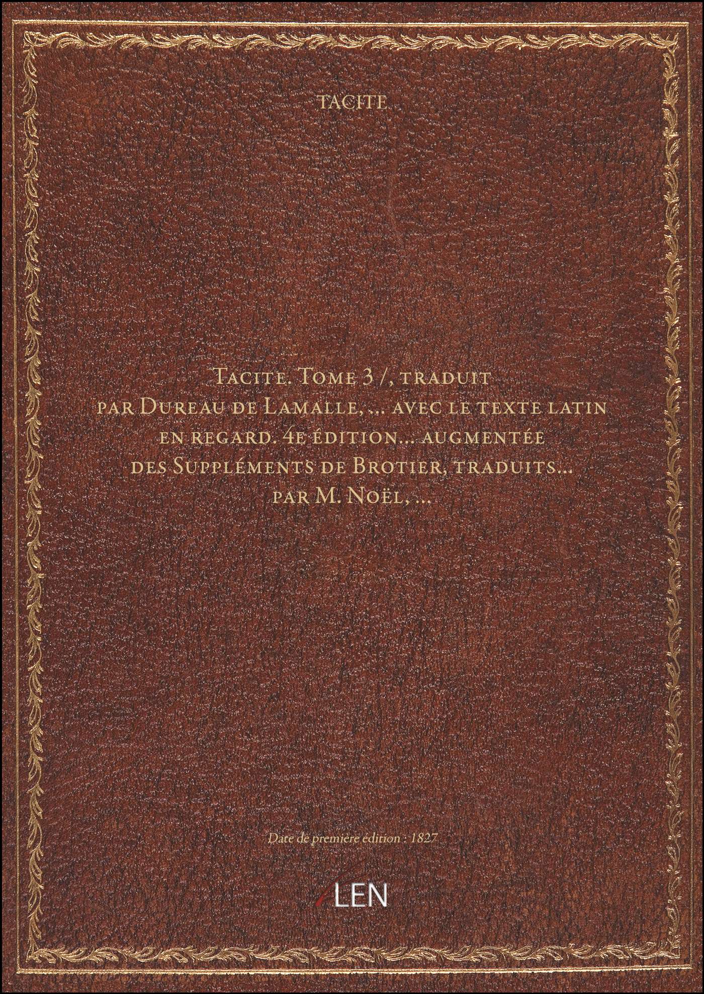 Titre complet : Tacite. Tome 3 / , traduit par Dureau de Lamalle,... avec le texte latin en regard. 4e édition... augmentée des Suppléments de Brotier, traduits... par M. Noël,...