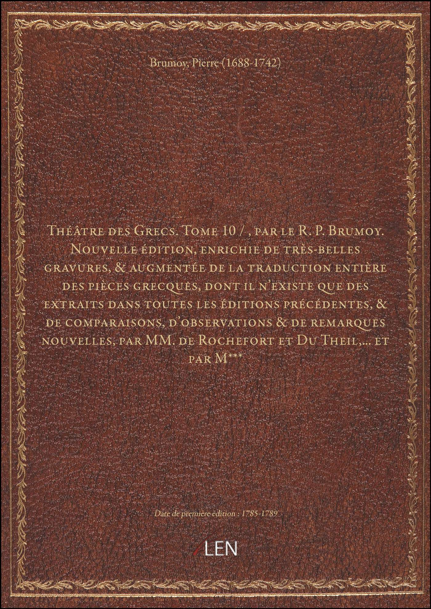 Titre complet : Théâtre des Grecs. Tome 10 / , par le R. P. Brumoy. Nouvelle édition, enrichie de très-belles gravures, & augmentée de la traduction entière des pièces grecques, dont il n'existe que des extraits dans toutes les éditions précédentes, & de comparaisons, d'observations & de remarques nouvelles, par MM. de Rochefort et Du Theil,... et par M***