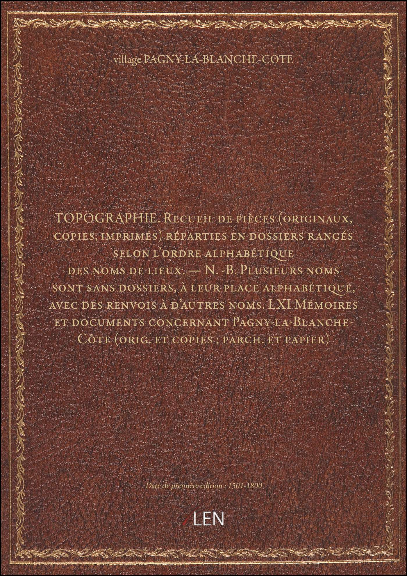 Titre complet : TOPOGRAPHIE. Recueil de pièces (originaux, copies, imprimés) réparties en dossiers rangés selon l'ordre alphabétique des noms de lieux. — N.-B . Plusieurs noms sont sans dossiers, à leur place alphabétique, avec des renvois à d'autres noms. LXI Mémoires et documents concernant Pagny-la-Blanche-Côte (orig. et copies ; parch. et papier)