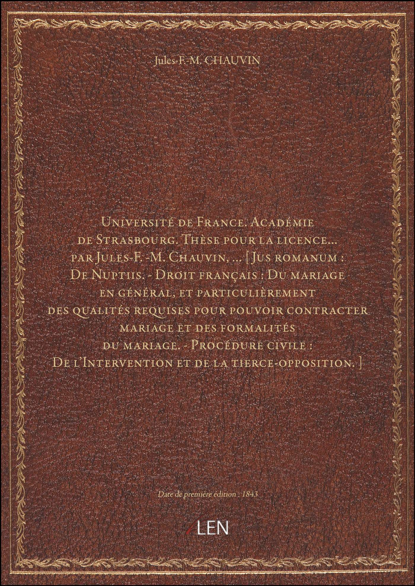 Université de France. Académie de Strasbourg. Thèse pour la licence... par Jules-F.-M. Chauvin,... [Jus romanum : De Nuptiis. - Droit français : Du mariage en général, et particulièrement des qualités requises pour pouvoir contracter mariage et des [...]