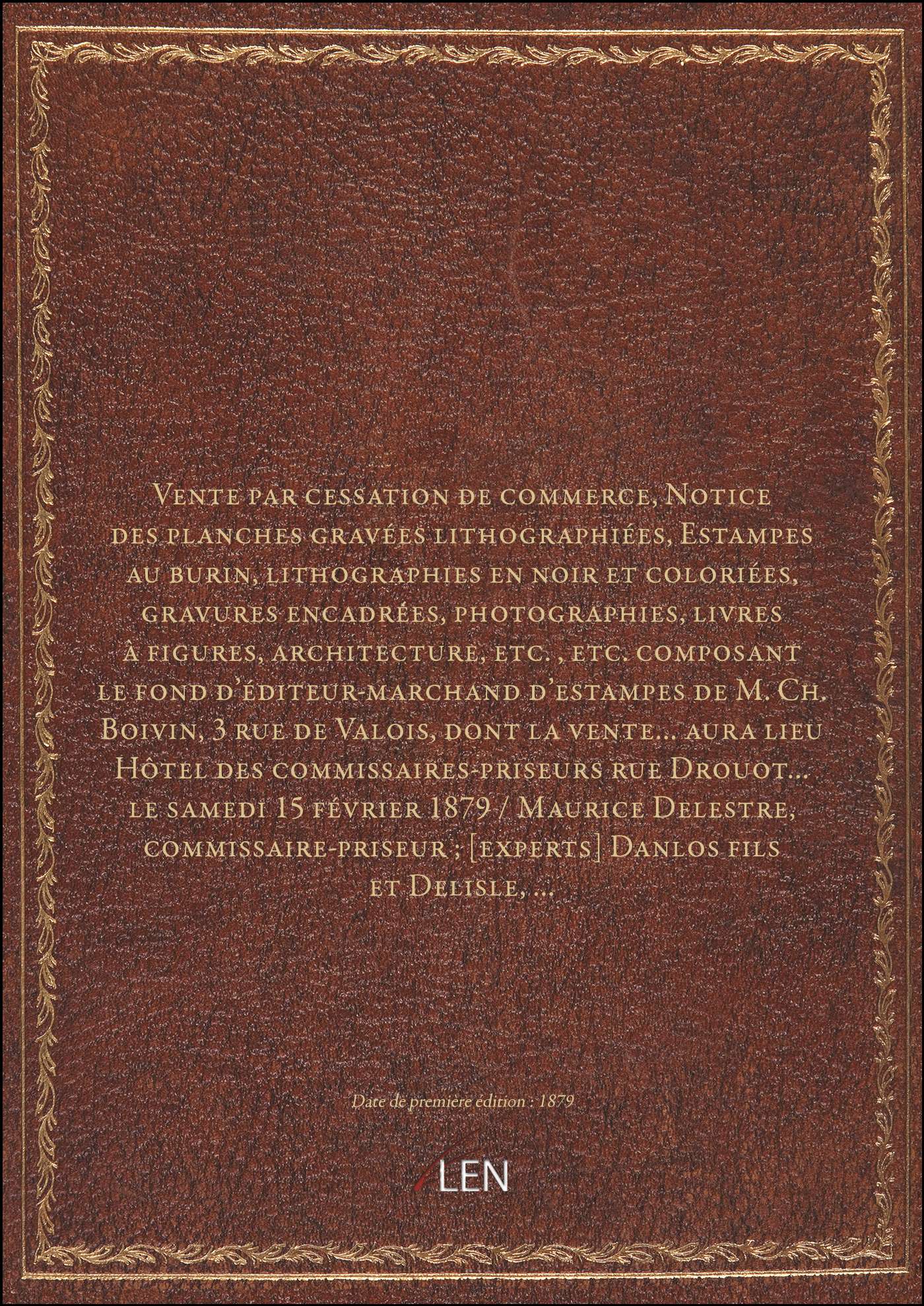 Titre complet : Vente par cessation de commerce, Notice des planches gravées lithographiées, Estampes au burin, lithographies en noir et coloriées, gravures encadrées, photographies, livres à figures, architecture, etc., etc. composant le fond d'éditeur-marchand d'estampes de M. Ch. Boivin, 3 rue de Valois, dont la vente... aura lieu Hôtel des commissaires-priseurs rue Drouot... le samedi 15 février 1879 / Maurice Delestre, commissaire-priseur ; [experts] Danlos fils et Delisle,...