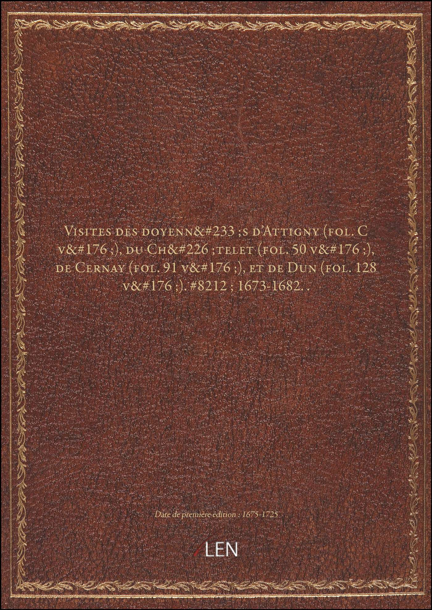 Titre complet : Visites des doyennés d'Attigny (fol. C v°), du Châtelet (fol. 50 v°), de Cernay (fol. 91 v°), et de Dun (fol. 128 v°). — 1673-1682..