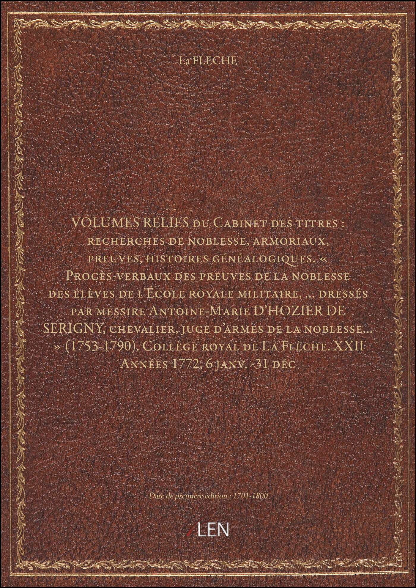 Titre complet : VOLUMES RELIES du Cabinet des titres : recherches de noblesse, armoriaux, preuves, histoires généalogiques. « Procès-verbaux des preuves de la noblesse des élèves de l'École royale militaire, ... dressés par messire Antoine-Marie D'HOZIER DE SERIGNY, chevalier, juge d'armes de la noblesse... » (1753-1790). Collège royal de La Flèche. XXII Années 1772, 6 janv.-31 déc