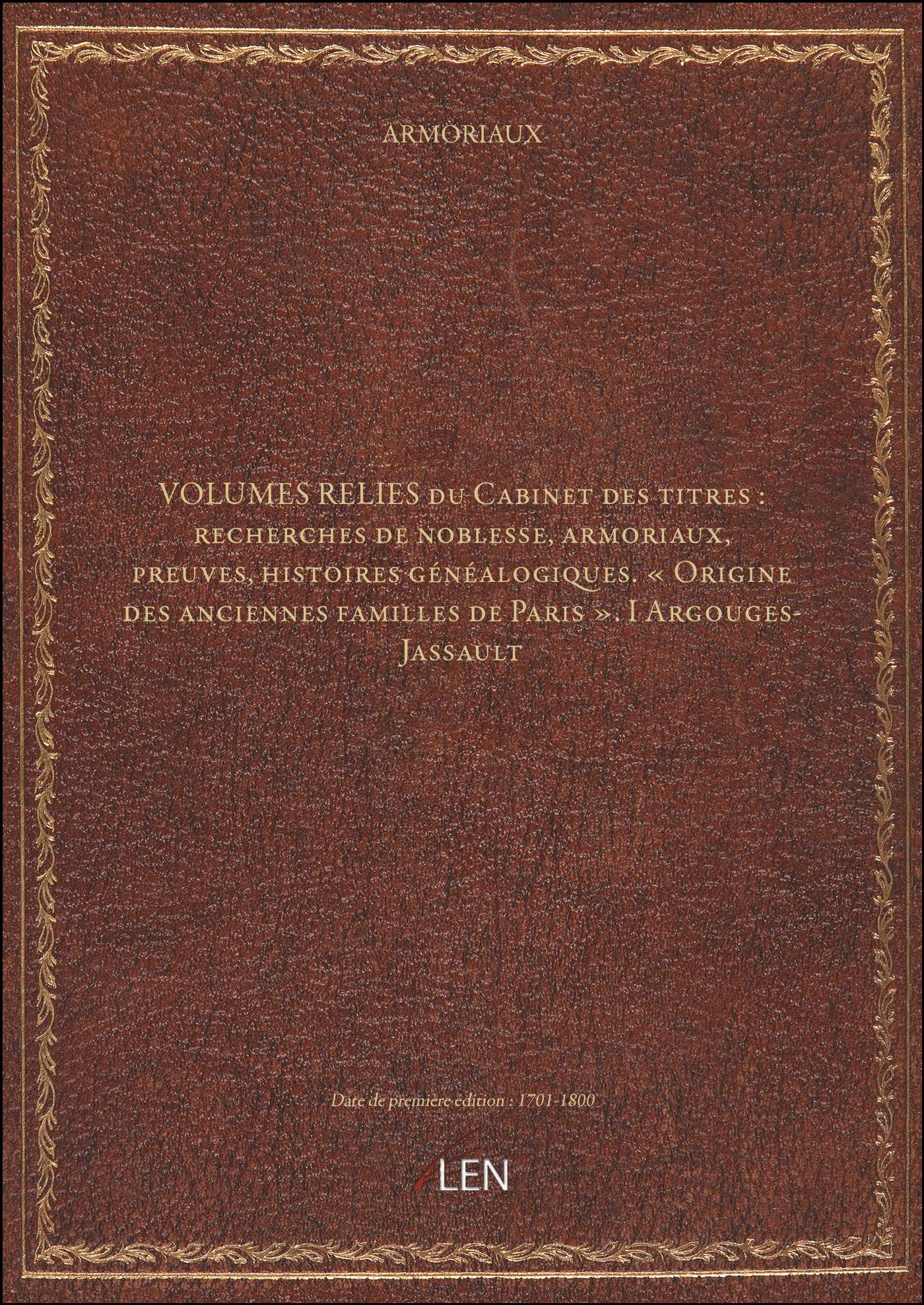 VOLUMES RELIES du Cabinet des titres : recherches de noblesse, armoriaux, preuves, histoires généalogiques. « Origine des anciennes familles de Paris ». I Argouges-Jassault