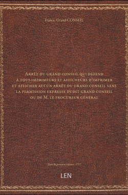 Arrêt du grand conseil qui defend à tous imprimeurs et afficheurs d'im... 20,00 € Sélectionner le voteGive it 1/5Give it 2/5Give it 3/5Give it 4/5Give it 5/5 Aucun vote pour le moment