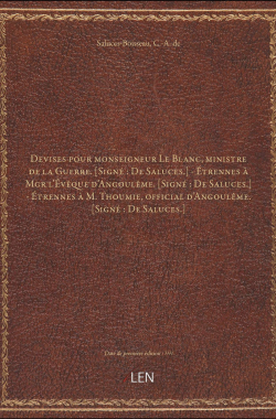 Devises pour monseigneur Le Blanc, ministre de la Guerre. [Signé : De ... 15,00 € Sélectionner le voteGive it 1/5Give it 2/5Give it 3/5Give it 4/5Give it 5/5 Aucun vote pour le moment