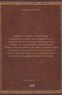 Arrêt du conseil d'état contre le nommé Guillaume, marchand de Vin, sa... 20,00 € Sélectionner le voteGive it 1/5Give it 2/5Give it 3/5Give it 4/5Give it 5/5 Aucun vote pour le moment