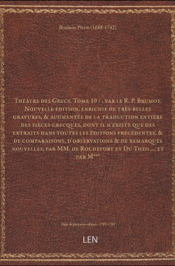 Théâtre des Grecs. Tome 10 / , par le R. P. Brumoy. Nouvelle édition, ... 170,00 € Sélectionner le voteGive it 1/5Give it 2/5Give it 3/5Give it 4/5Give it 5/5 Aucun vote pour le moment