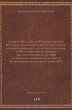 Lettre de Mgr le duc de Richelieu, président du conseil des ministres ... 15,00 € Sélectionner le voteGive it 1/5Give it 2/5Give it 3/5Give it 4/5Give it 5/5 Aucun vote pour le moment