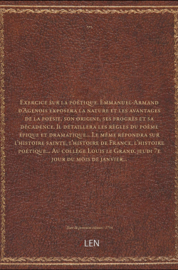 Exercice sur la poétique. Emmanuel-Armand d'Agenois exposera la nature... 25,00 € Sélectionner le voteGive it 1/5Give it 2/5Give it 3/5Give it 4/5Give it 5/5 Aucun vote pour le moment