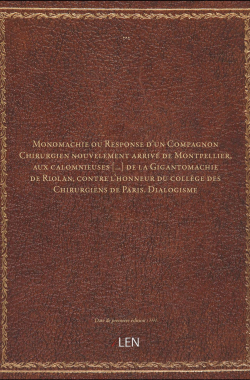 Monomachie ou Response d'un Compagnon Chirurgien nouvelement arrivé de... 20,00 € Sélectionner le voteGive it 1/5Give it 2/5Give it 3/5Give it 4/5Give it 5/5 Aucun vote pour le moment