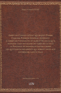 Arrêt du Conseil d'Etat qui reçoit Pierre Carlier, Fermier Général, op... 20,00 € Sélectionner le voteGive it 1/5Give it 2/5Give it 3/5Give it 4/5Give it 5/5 Aucun vote pour le moment